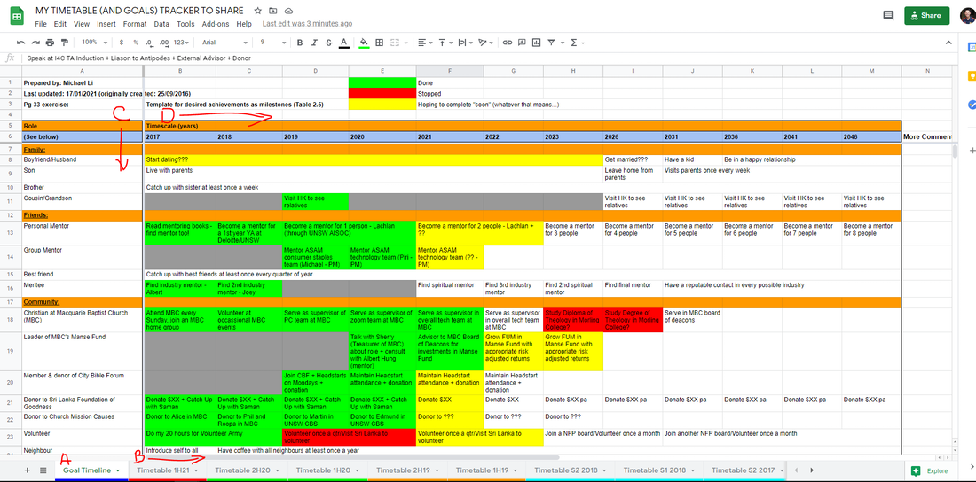 D: I have listed some different milestones per role in my life in the picture above, going to the right of the rows. This tracker can also help me assess whether there are milestones I have hit, missed, or planning to hit soon based on my above traffic light colour scheme. This is useful as a backward looking and forward looking tool to understand the "KPIs" I have set for myself. There could be milestones in the future, that I "red highlight" now (e.g. studying theology at Morling College") , to mentally signal that I won't spend time there, because I want to focus on other "roles" and hitting those milestones instead (e.g. voluntarily advising the Macquarie Baptist Church Manse Fund). This frees up the headspace I need to attack other things efficiently. In other words, this section provides me a lot of mental clarity.