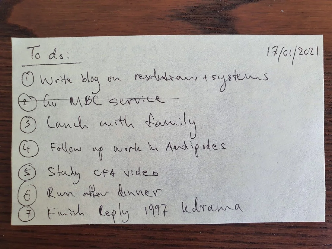As you can see, I am fairly intentional about the tasks I need to get done for a day. That also includes my "relaxation" time, e.g. finishing off the Reply 1997 k-drama series. The sticky notes was something I only started to revive again in 2020, and I have been doing this almost religiously every day now. This helps keep me micro focused on the tasks that I prioritise and need to get done. If you want to be hyper focused (which is something I learnt from my boss at Antipodes), you can even include "time limits" in your sticky notes for each of the tasks, by estimating how long you think each task takes. I find that psychologically helps at times when there's a lot of tasks to get done and it can all seem overwhelming. The last thing you want is to feel overwhelmed, so any small "wins" on small and quick tasks you can get done by crossing off your sticky note is a good way to build momentum and avoid procrastination.