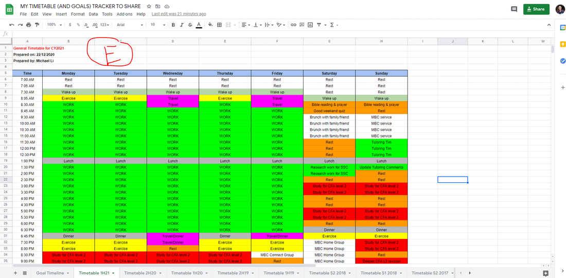 E: I have included below the most recent 1H2021 timetable which I am currently following as a guide. As you can see, like I've said, I've broken down my time blocks into more granular "30 mins" or less to be more intentional about the time I spend on certain areas. No surprise, my love language is "quality time". Some say I have an obsession with this idea of time... I admit, a lot of friends have complained about my colour schemes, and I'm sure others who follow my framework can come up with better colours... This timetable is not to constrain me from doing anything else in the allocated time slots. As always, I don't follow this timetable religiously because the world is always changing, but it is like a "default" plan to tell me what I "could or should" be doing whenever I feel I have those moments of "what should I be doing right now?".